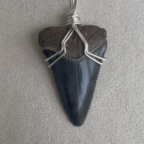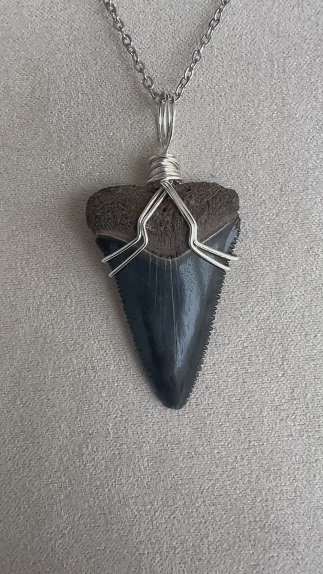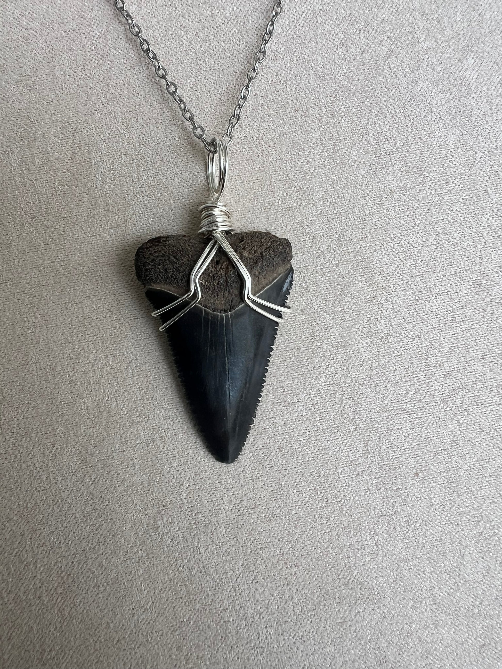 Carry a piece of ocean history with you wherever you go. This handcrafted necklace features a genuine fossilized great white shark tooth, carefully wrapped in silver wire This tooth is a one-of-a-kind fossil, naturally preserved for millions of years, making your necklace completely unique.
