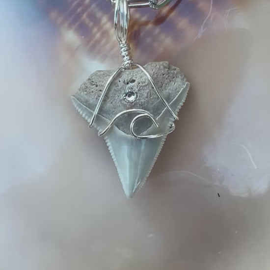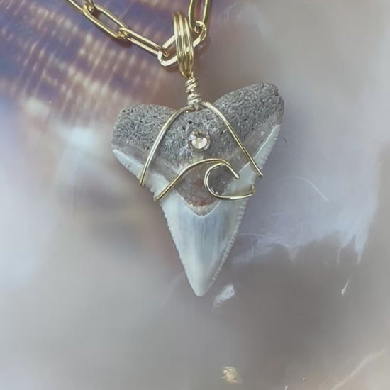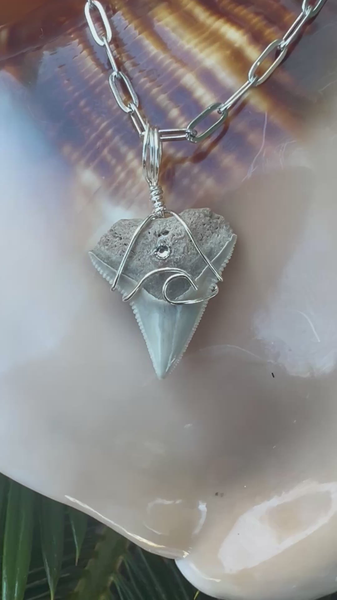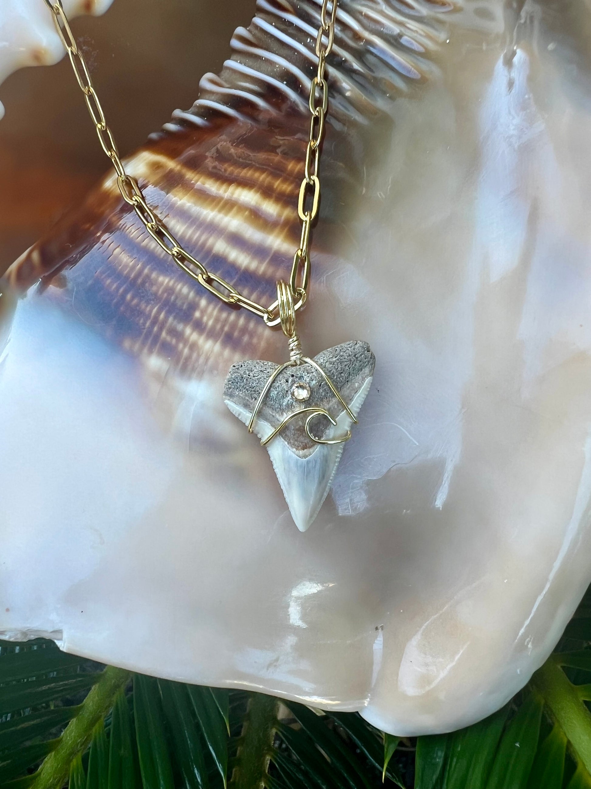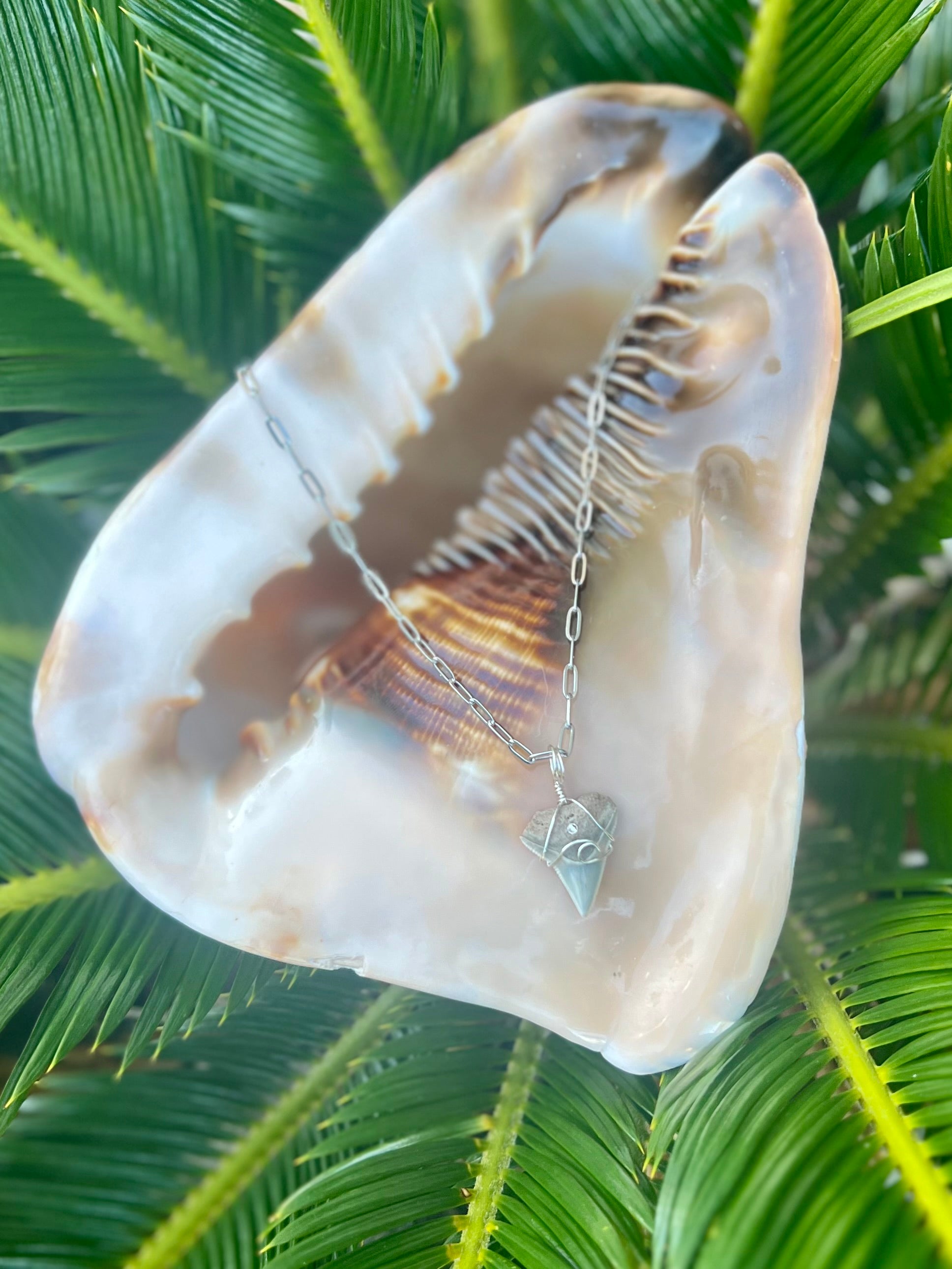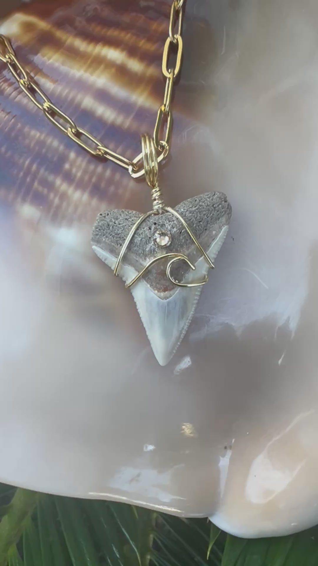 Embrace the spirit of the sea with this one-of-a-kind bull shark tooth, carefully wrapped with wire and accented with a sparking crystal and crashing wave design. This necklace is the perfect balance of coastal luxury and raw ocean energy 🩵