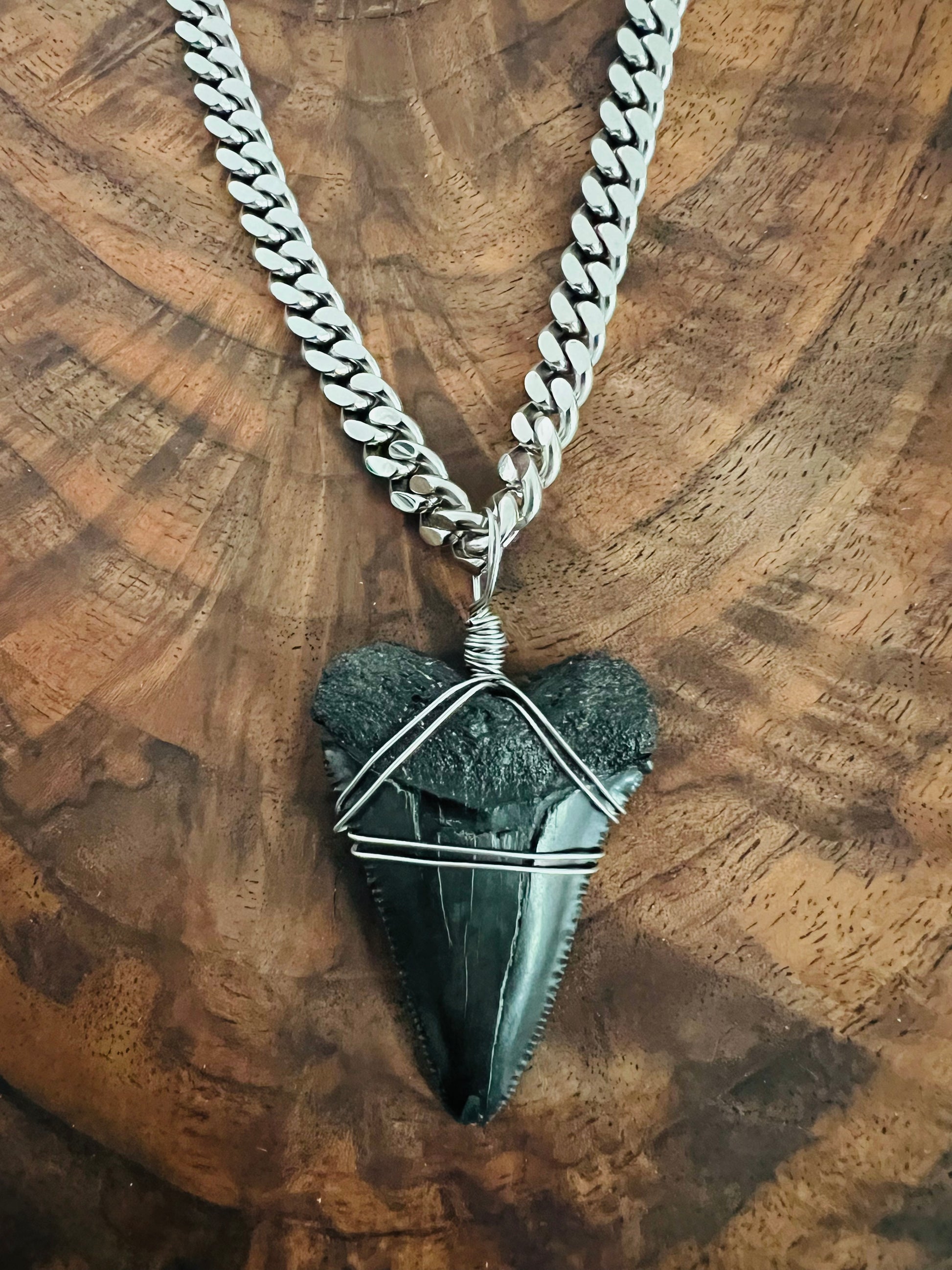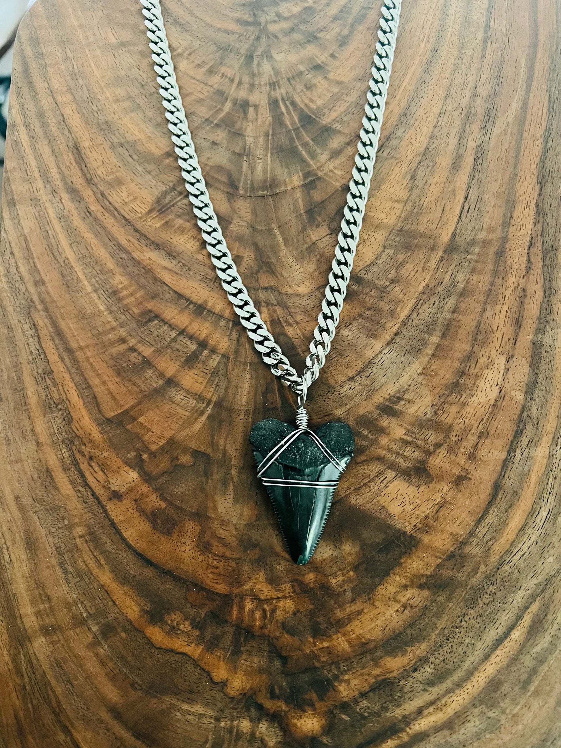 Unearthed from ancient ocean beds and forged into a statement piece for the bold—this 2“ fossilized Great White shark tooth necklace carries the raw power of the sea. This genuine tooth is millions of years old, naturally preserved, hand collected from local Carolina beaches and hand-wrapped in durable wire for a rugged, weathered look that tells a story all its own.