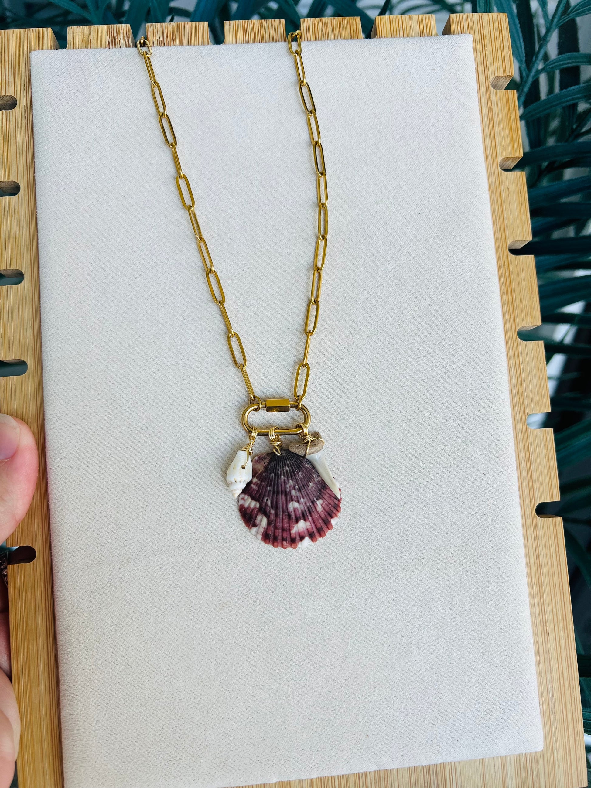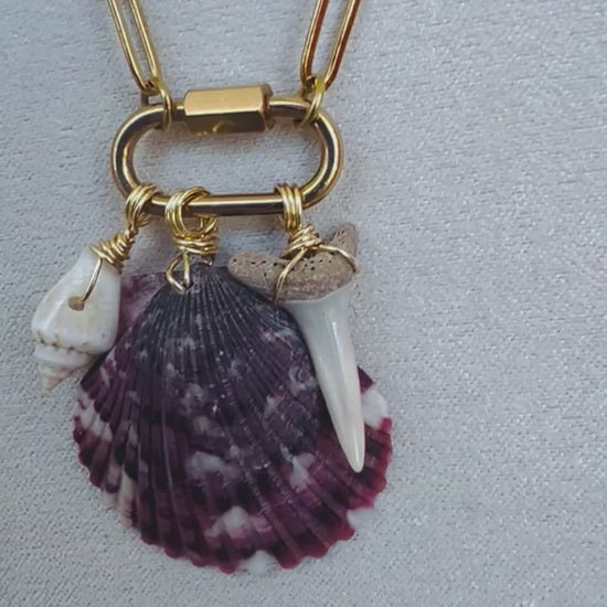 Bring coastal luxury to your everyday look with this one-of-a-kind handcrafted necklace. Featuring a calico scallop (Argopecten gibbus) shell, small white shell, and a cream colored Tiger Shark tooth, this design captures the beauty of the ocean’s natural treasures.