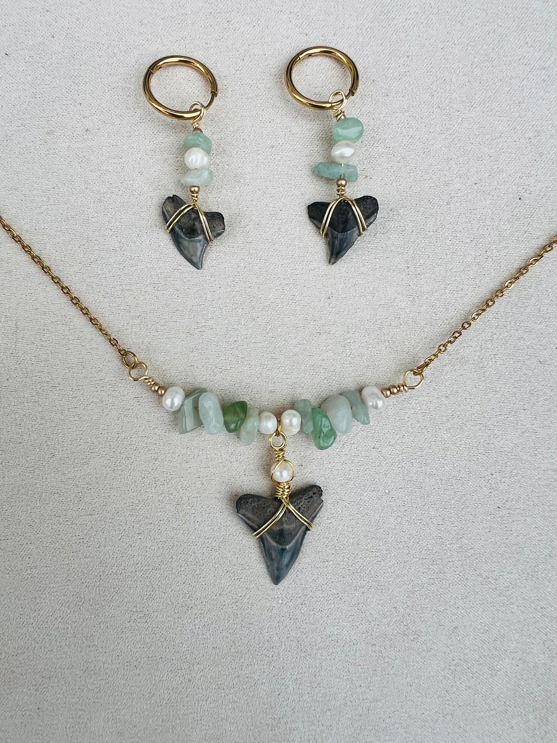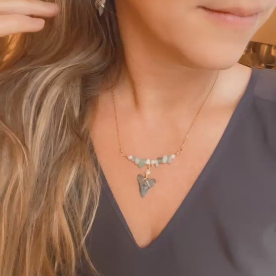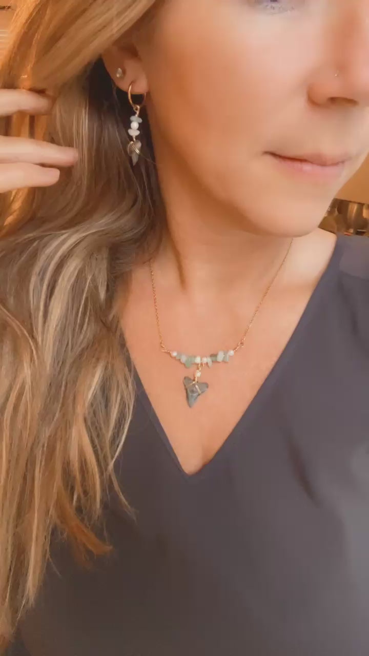 Ocean Treasure Necklace - Bull Shark tooth + Aventurine and Pearls