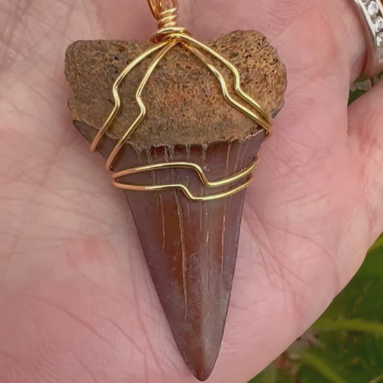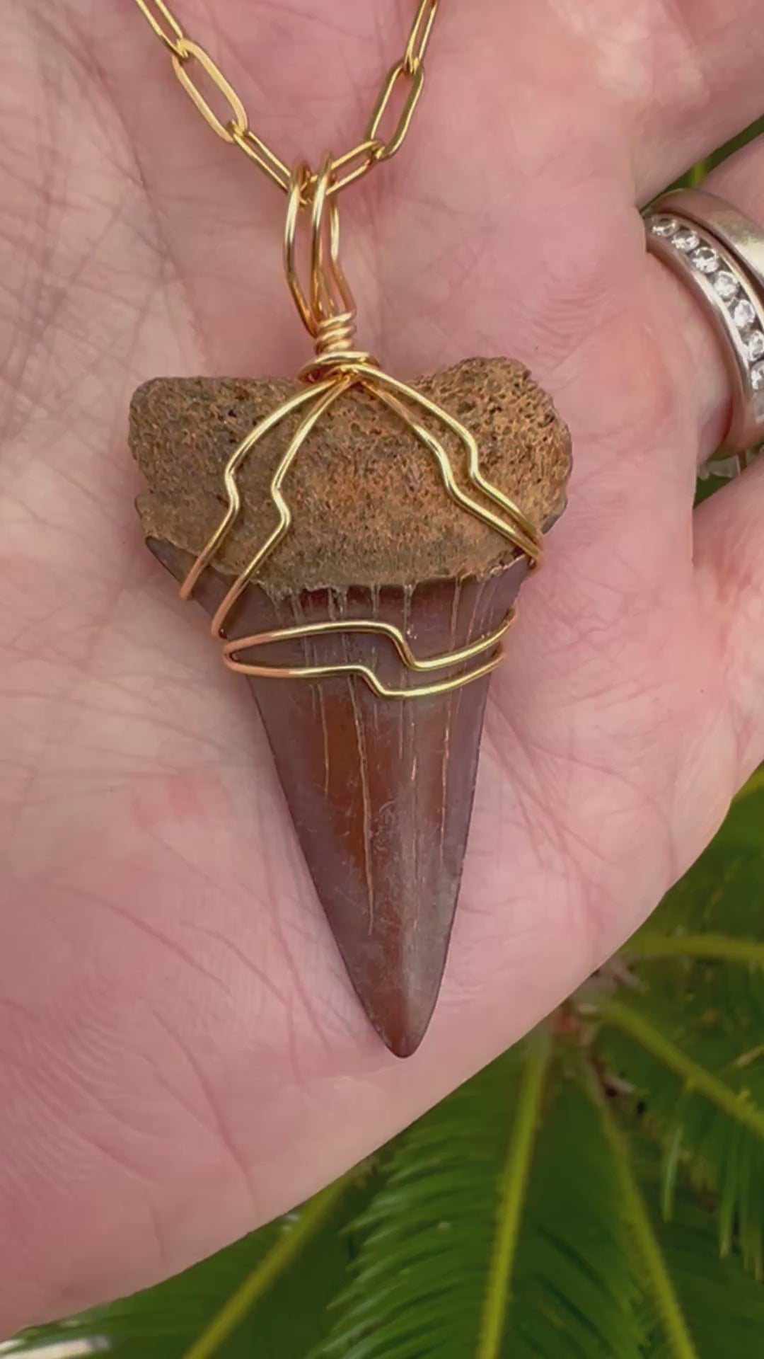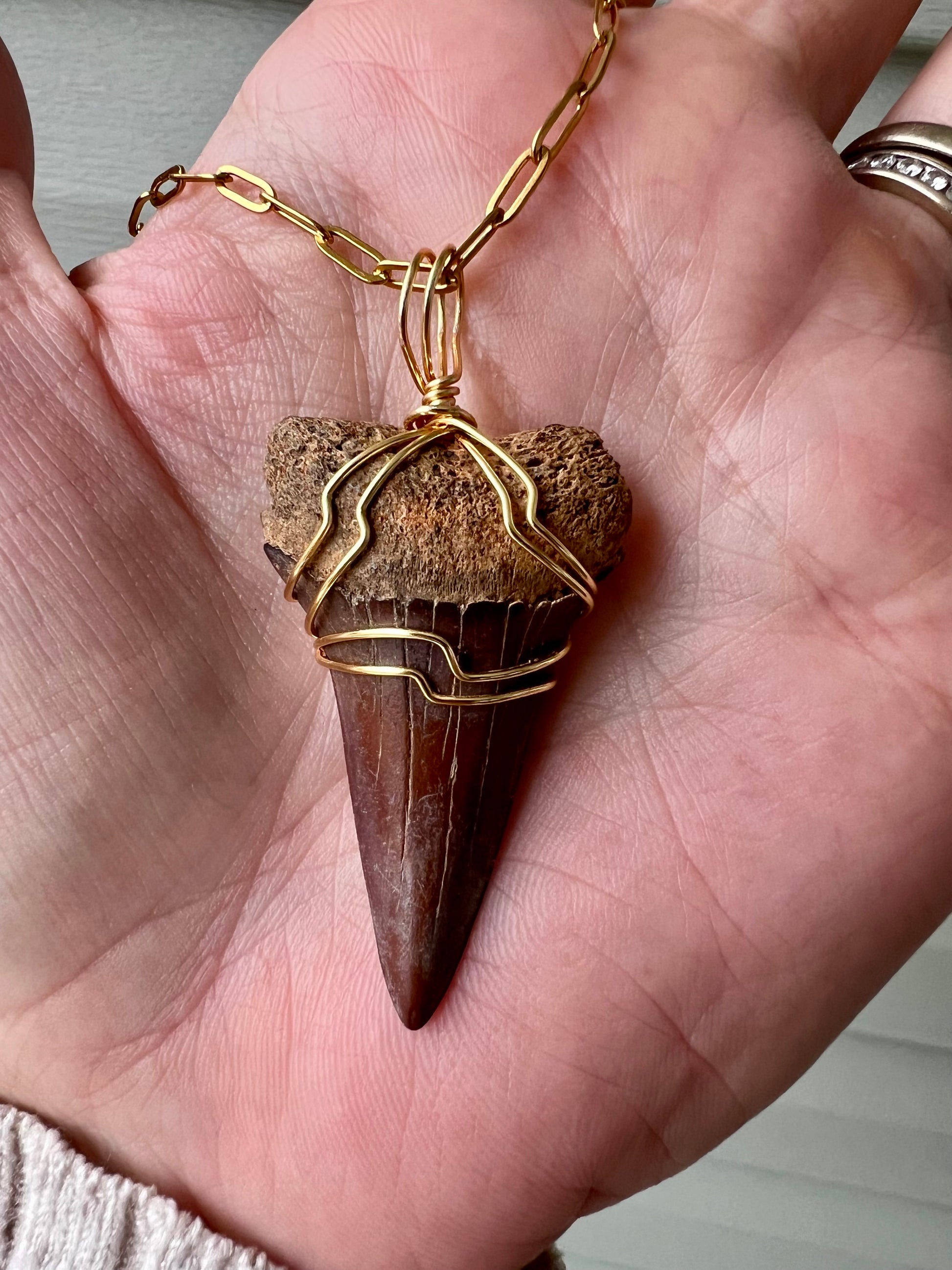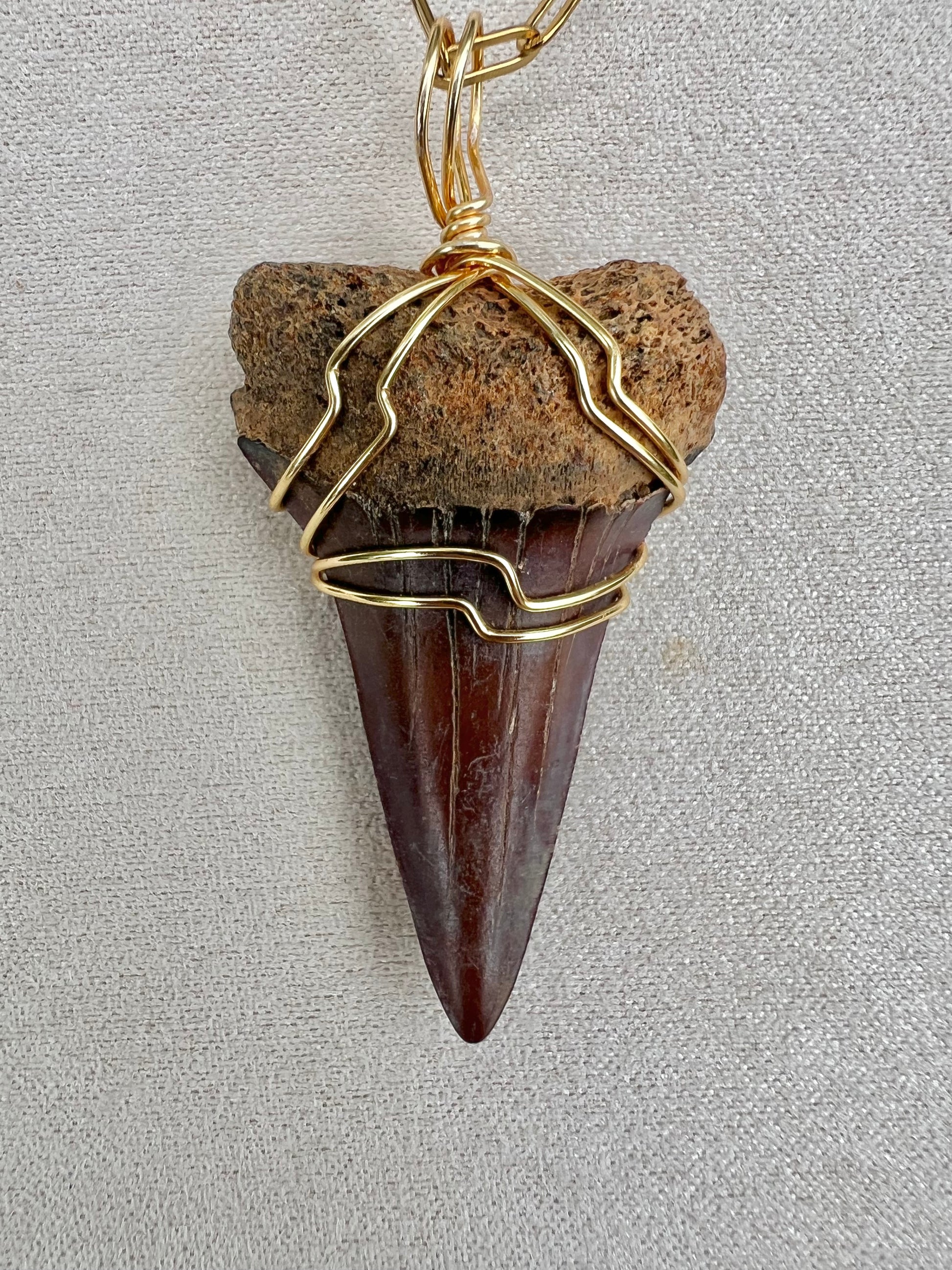 Bold, sleek, and naturally striking — this one-of-a-kind necklace features a genuine fossilized mako shark tooth wrapped in rich, golden wire for a look that’s both earthy and elevated. The tooth’s deep burgundy chocolate color and textured fossil root create a stunning contrast.